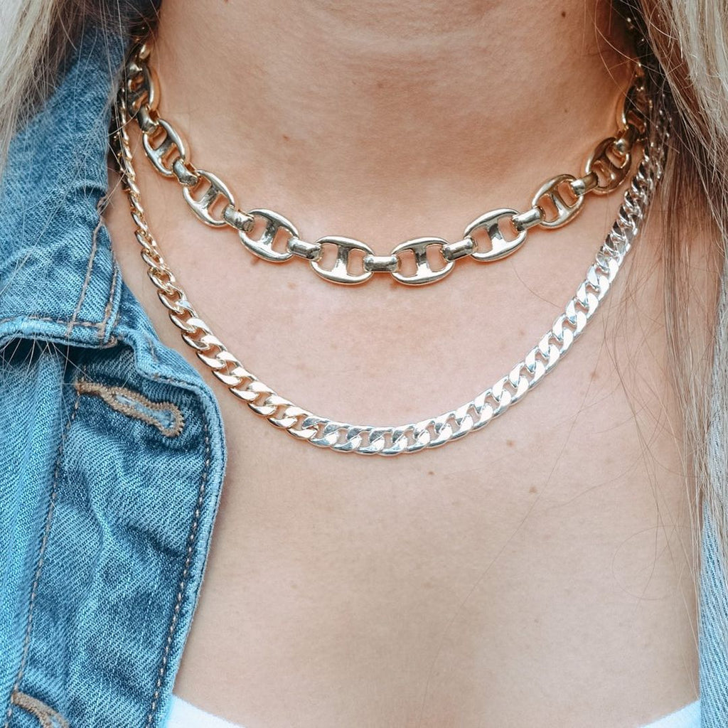This look combines the gold rounded rolo necklace with the two-tone link chain for a fabulous casual style!